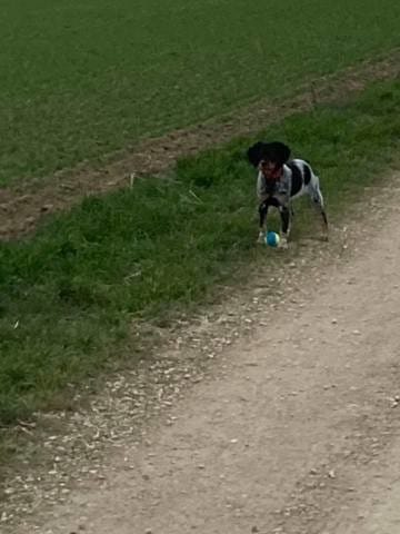 Et on a joué à la balle. Aller la chercher il comprend, mais un coup il la ramène et un coup il la "surveille" jusqu'à ce qu'on vienne la chercher XD