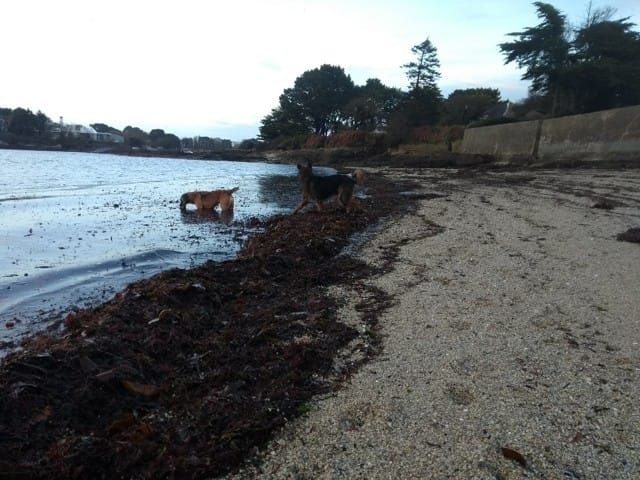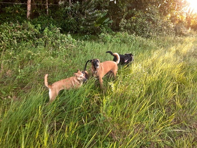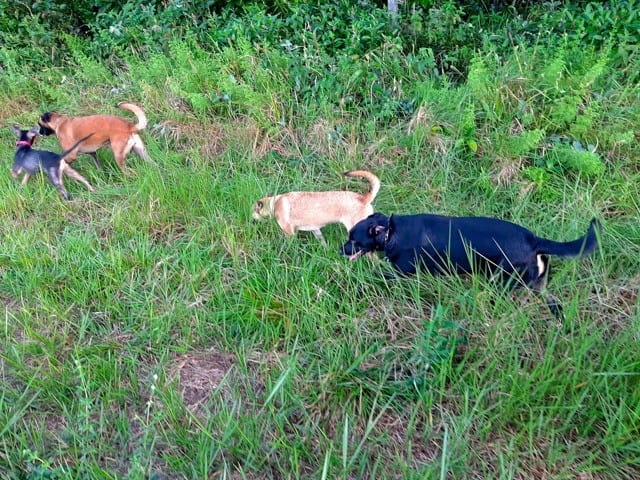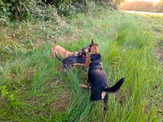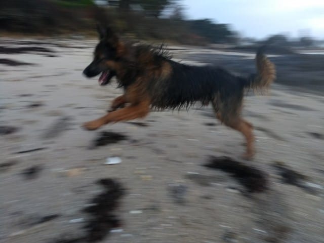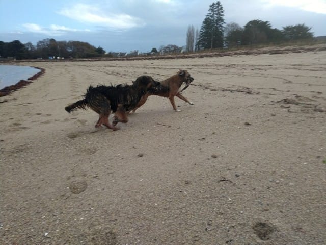 Le soleil est revenu et on a fait une super balade ce matin, avec tous ce qu'aime Nono : courir après une balle (merci le lance-balle qui soulage mes épaules !) courir comme un dératé avec une copine, faire des roulés-boulés et se mordiller les oreille. On a rencontré sa copine Leika qui "faisait la clôture" pour venir jouer avec Norkham quand elle fuguait de chez elle... ce qui m'avait permis de prendre la fameuse photo du créole à 6 pattes !