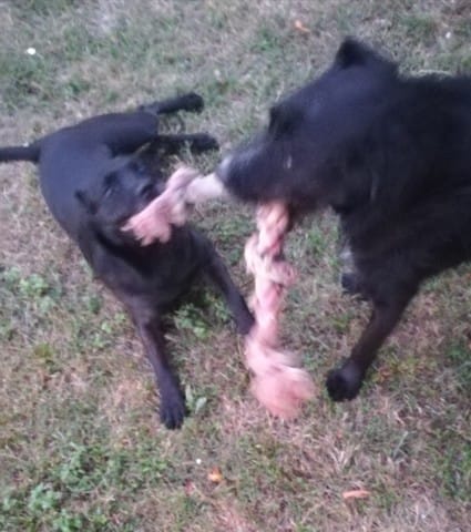 Séance de corde entre un staffie et un griffon qui va gagner