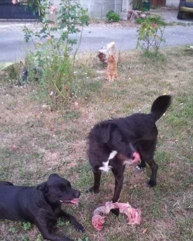 (D'ailleurs je me suis dit qu'au bout d'un certain nombre de chiens, ce serait limite "mauvais" de les faire manger si près les uns des autres... parce que même si tout le monde attend la gamelle en mode bon élève, une fois qu'ils ont le nez dedans l'instinct reprend le dessus et il y a clairement une pression quand ils mangent en groupe. Juste une petite réflexion comme ça, en prévision de ma future meute de soixante-douze 😁)