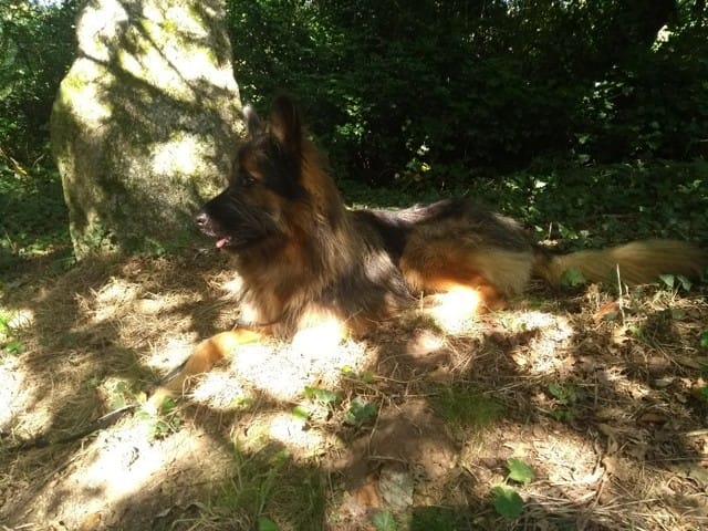 Petite séance de télépathie avec un menhir pour se remettre de ses émotions (ce chien aime les pierres, il a tendance à se coucher à côté)
