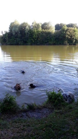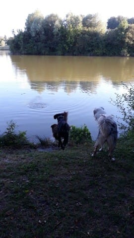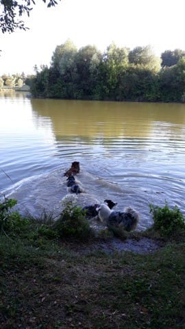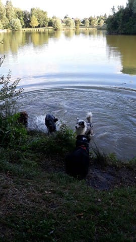 Bref, c'était aussi sa première fois dans un étang. Jaskier a été tout à fait conquis, il n'a hésité que quelques secondes avant de se lancer à la poursuite des deux bergers! Puis comme c'était clairement impossible de le garder attaché, je l'ai détaché pour la première fois. Énorme stress au vu de son rappel en longe ("j'entend, mais je m'en fiche; je viendrais peut-être dans 5mn"). Au final, aucun soucis malgré les quelques personnes qui on pu passer à côté de nous. Il s'est barré deux/trois fois pendant les 30 premières minutes mais les autres le ramenaient. A la fin il a fait sa petite vie en solo dans les champs alors que les autres restaient à notre pas. Il m'a fait une petite frayeur mais est revenus tout heureux.