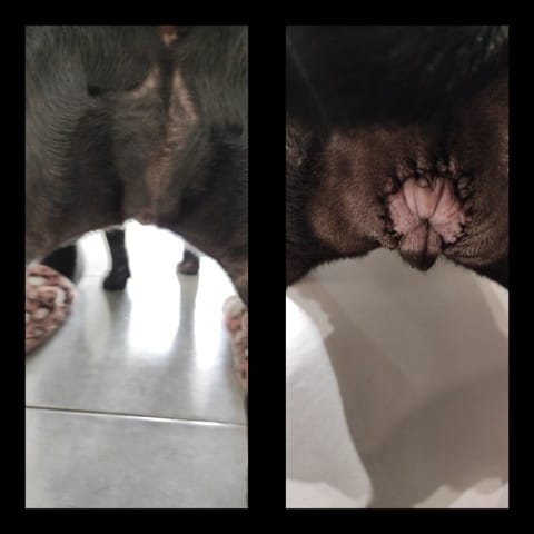 Jai pris un peu peur...il m'avait dit les risques...sutures qui ne tiennent pas( ma chienne est très musclé ,elle a un bon fessier) , retirer assez de peau sinon rebelote....