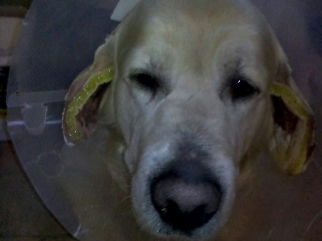 Notre Golden Retreiver "Benjy" a un Othématome depuis environ 7 semaines. J’expose ici la façon dont nous avons traité ce problème, car elle a donné de bons résultats . L’othématome a été consécutif au développement d’un parasite dans l’oreille droite, on peut sans peine imaginer les démangeaisons et par là, pourquoi « Benjy » se grattait avec la patte et/ou secouait fréquemment la tête. Sa patte et la force centrifuge (Rotation de la tête) ont provoqué la rupture d’un ou plusieurs vaisseaux sanguins.