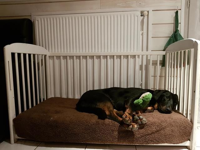 Nous vivons en appartement, et à droite de la porte d'entrée nous avions une pièce qui ne nous servez à rien, nous avons donc décider de l'utiliser pour faire une petite chambre pour nos deux chiens. Ils s'y sentent bien, leurs gamelles sont dedans, et ils ont une couvertures et une petite litière au fond qui sert plus de bac à sable pour Démon mais bon !