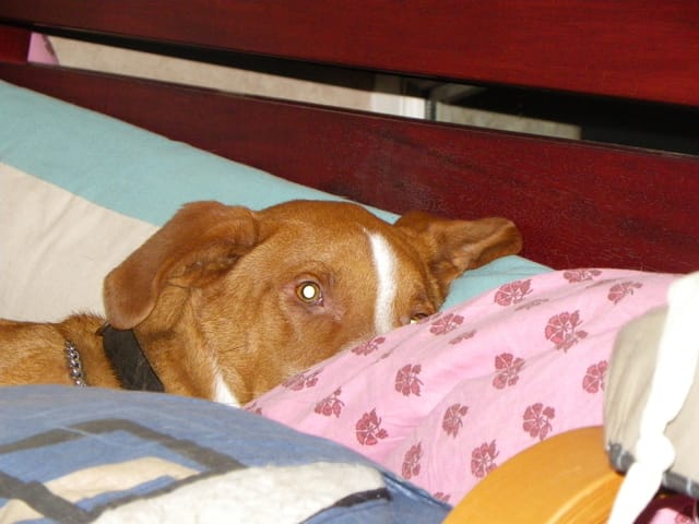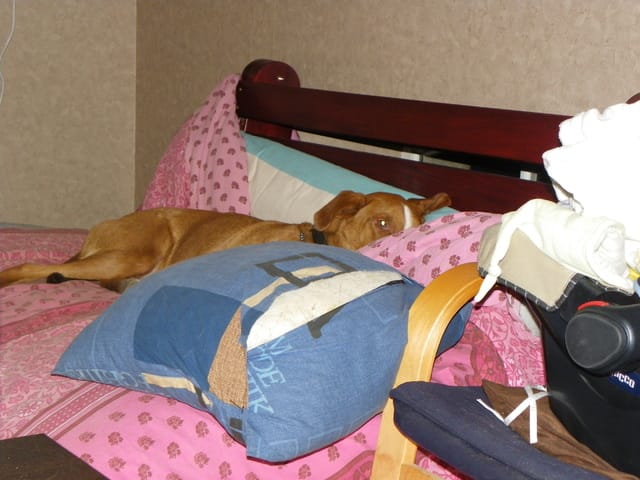 Et puis en fait cela ne me gêne pas qu'il s'y couche (les chats y vont aussi) et quand je veux qu'il s'en aille, je l'appelle tout simplement et il vient bien volontiers. Si j'y suis aussi, il se couche à côté de moi ou à l'autre bout, selon qu'il a envie de chaleur ou non.