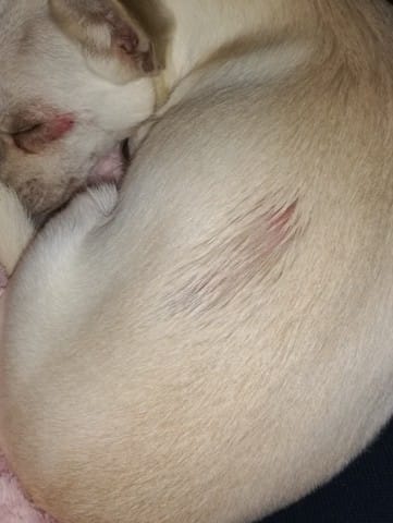 En rasant sa tête, on a découvert plein de grosses plaques rouges à sang, sur son front, son museau, dans ses oreilles et sur son menton, cachés par les poils. Le véto sait pas trop ce que c'est, mais sur un si petit chien, bah c'est vachement impressionnant.