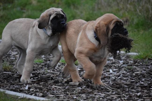 Inutile de vous dire combien ma joie est grande! Je suis impatiente mais sereine puisque tout à été fait en règle et que désormais je peux voir MON petit Mastiffon évoluer tous les jours! Finalement toute la famille est au comble du bonheur! Mes enfants l'aime déjà autant que moi (presque) et tout le monde cherche sur internet et dans les magasins les cadeaux pour le nouvel arrivant! J'ai déjà commandé beaucoup d'articles malgré que j'ai déjà tout ce qu'il faut! La rencontre avec iago et Tibidou s'est passé comme je l'avais espéré! Que du bonheur! Je vais vous épargner tous les points positifs des éleveurs avec qui j'ai passé une grande partie de la journée, la liste serait trop longue! Si je ne me trompe pas, je vais hériter "du clown de service"! Monsieur Simba se distingue des autres! Il est en quelque sorte le "philosophe" de la portée! Déjà que le Mastiff réfléchi longuement avant d'agir mais Simba est un champion du monde! Il aime (surtout les gâtés) et supporte toutes les situations sans être perturbé le moins du monde! C'est le seul lors des promenade à être un peu distant des autres et à revenir avec une énorme touffe d'herbe dans la bouche ou autre! Je crois que pour la première fois je vais devoir "garer" certaines choses car il aime découvrir ce petit! Il n'y a plus un fil qui traîne dans la maison tout est sous gaine. Je pense que je n'ai pas fini de rire avec lui! Biz à tous! Et encore merci de m'avoir un peu "Booster" vous aviez mille fois raison!