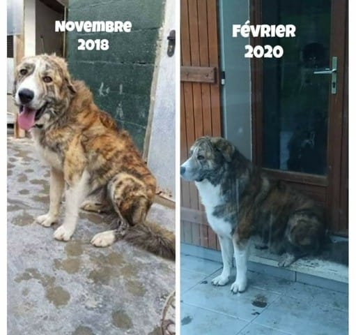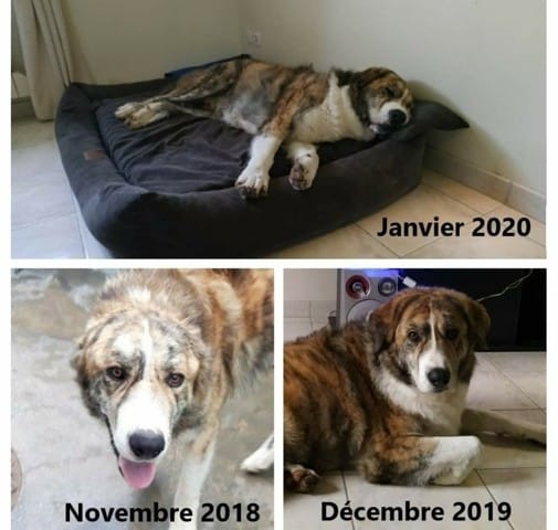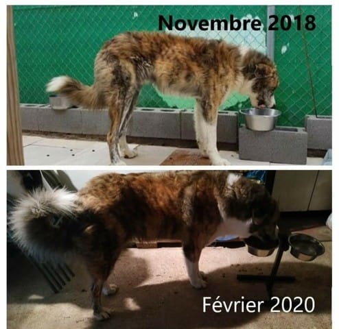 Les photos avant/après sont très impressionnante c'est clair, le poids et le poil qu'il a pris ! Il a 2ans et demi maintenant c'est ça ?