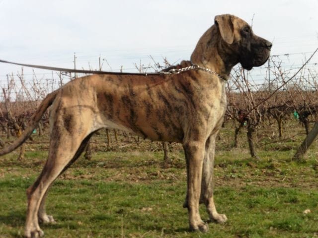 Il est fauve bringé noir, panachure blanche. En fait, sa robe de base est similaire à celle de ce dogue allemand, sauf qu'il a une panachure blanche et pas de masque noir :-)