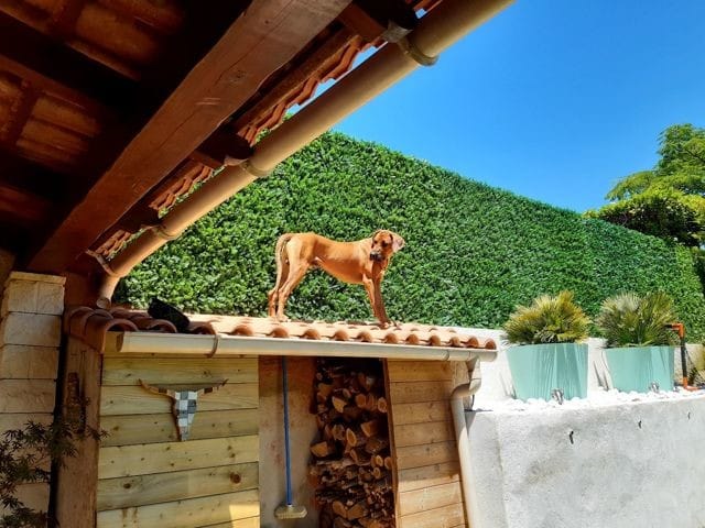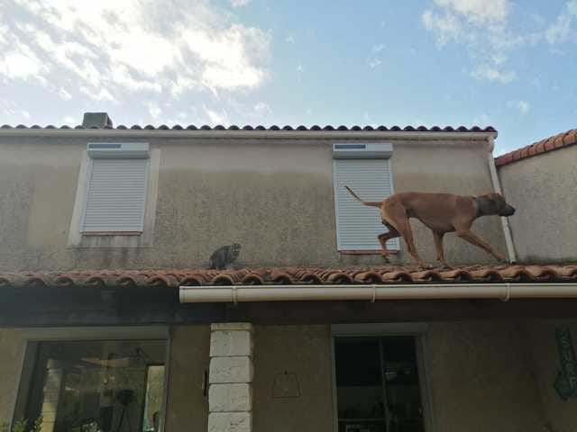 Sa grande trouvaille aussi : il suit le chat sur le toit ... il adoooore être perché, ce qui à 48 kg et des pattes de dogue reste un problème tuilistique... c'est un chien un peu étrange, je l'avoue...!