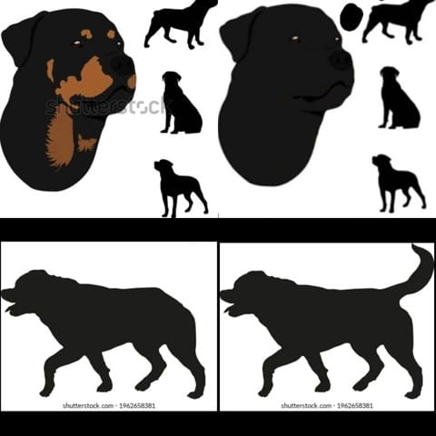 Pareil, sur la photo du bas, juste question silhouette, on voit que c'est un rott alors que si on rajoute une queue, on sait plus que c'est un rott.... On peut faire le test mais si je post des silhouettes de chien vous allez reconnaître beaucoup de race mais pas le rott, car sans ses couleurs, il fait pas peur...