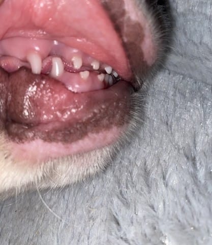 Effectivement si ce sont les dents de lait de votre animal le problème est moins embêtant que si il avait s'agit de ses dents d'adulte. Assurez vous que ce n'est tout de même pas douleureux pour lui (auquel cas je vous conseille de contacter votre vétérinaire) et que ça ne lui pose pas de problème pour manger (que ce soit pour la prise alimentaire ou pour la mastication des aliments) afin que son état général ne se dégrade pas, car à cet âge le chien a besoin d'un apport énergétique assez conséquent.