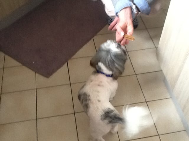 en fait, non la plupart du temps, il a une position classique, mais on dirait que quelque chose le gène à son arrière train ou sa queue, je ne sais pas, ce qui fait que des fois il a cette position.