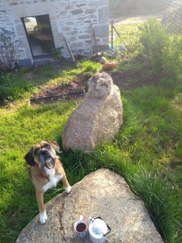 Cette photo du thé matinal sur les cailloux par exemple, il y a un peu plus d'un an ça n'aurait pas été possible. Les chats se doraient la pilule uniquement dans le potager (interdit à ma chienne, interdiction qu'elle respecte hyper bien d'ailleurs) et n'osaient que rarement en sortir à cause de la chieuse.