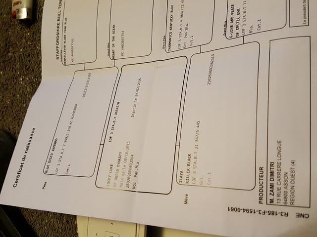 Non je parle du pedigree il l'on envoyer le 8 février donc c'est un staffie c'est bon et le marron si vous me dite non c'est qui a un problème c'est un pure j'ai vu mère et père donc c'est sur que oui alors que le noir j'étais pas sur mais la c'est bon merci à tous bonne journée