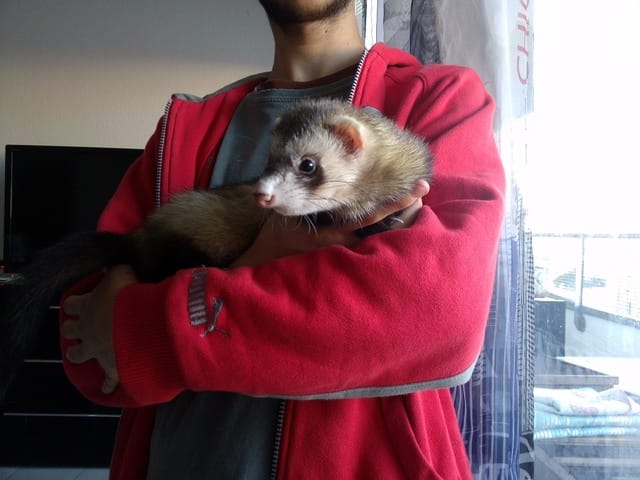 mes un monsieur ma vue en boule sur le trottoir il c'est approcher de moi la j'ai craché comme un chat et j ai lâcher un pét immonde il a reculer plus vite qui c'est approcher il ne ma pas approcher il et allés voir ou trouvez mon patron 15 mn plus tare je voie mon patron arrivée et la il ma poser dans c'est bras et je me suis blotti contre lui sans bouger il ma inspecter partout et j'ai fini bien au chaud dans mon dodo avec ma maman qui ma réconfortes toute la nuit. Le matin venue direction le veto donc mon patron a préparer ma cage de transport avec une couette et me voila partie au veto sur place inspection générale la veto voulez pas le croire je suit un survivent .Je c' est pas comment je ne me suit pas tuer atterrissage sur le sol en béton aie . J'ai rien de casser le veto a dit que je suit un super furet case coup loll