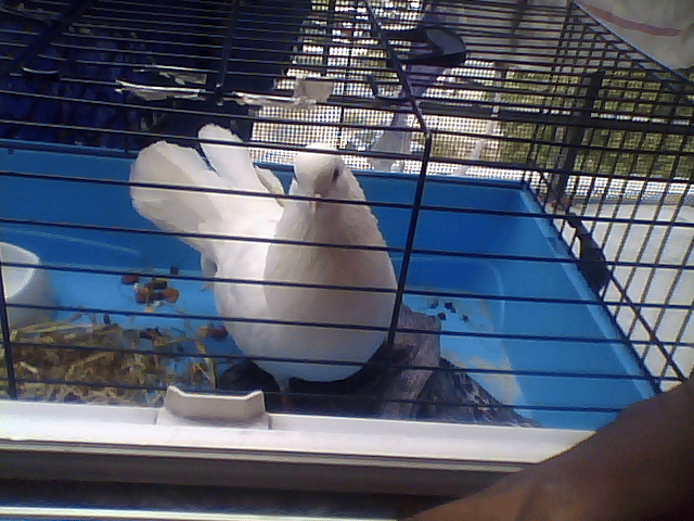 Aujorud'hui j'été au salon tranquillement entrain de regardez la télé quand ma cousine arrive et me dit qu'il y'a un pigeon dans ma chambre j'ouvre la porte de ma chambre et je voit un assez grand pigeon tout blanc sur le coup de la surprise je crie (réaction assez normal -.-') mais bizarrement il ne c'est pas envolée alors que ma fenetre été grande ouverte après plusieurs tentative il est enfin sortit mais bizarrement il ne s'envole pas il reste devant ma fenêtre tape sur la vitre marche sur le rebord (c'est sur qu'il c'est voler j'habite au 7ème étage dans un appartement) donc comme je lui ai donnez des graines pour hamster et de l'eau pour qu'il puisse au moins mangez après environ 20 minute il n'a toujours pas bougez ma mère ma donc dit de le faire entrez on ouvre la fenêtre et il saute sur le rebord de la fenetre on a reussit a le faire rentrez dans l'ancienne cage de mes cochons d'indes on pense achetez une volière bientot et partir achetez de la nourriture pouvez vous me renseignez sur cette oiseau