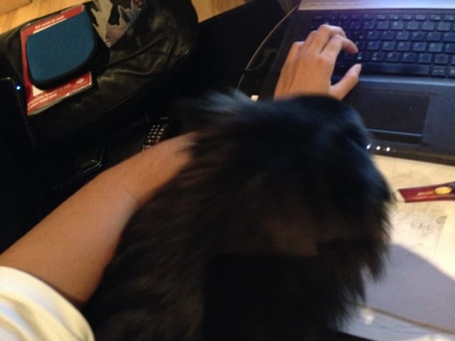 ou elle monte sur le canapé, passe derrére moi, et passe sou mon bras pour le lever du clavier xD ( elle admire mon nouveau dessin en court ! )