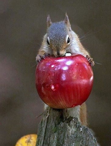 Un écureuil et sa grosse pomme toute rouge :