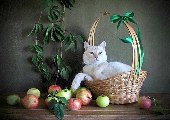 Un chat tout blanc dans un panier de pommes :