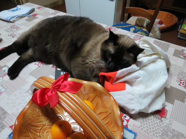 Photo prise ce matin. Cali ne veut pas que j'aille travaillé. Il est couché sur mon sac où je mets mon repas de midi.