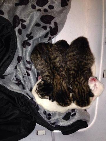 Avec les autres animaux je m'attendais à pire, la miss fait le gros dos mais Mikado la voit déja comme une future copine de jeux. Cacahuète quand à elle l'observe de loin ce qui ne l’empêche pas de manger dans la gamelle de Maïzena les croquettes spécial chaton ^^ avec le chien si il bouge pas ca va sinon la miss en a encore peur (en même temps il fait 110fois sa taille 😌 )