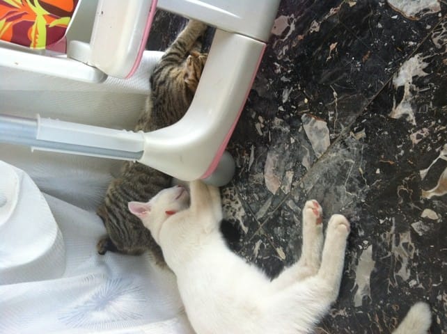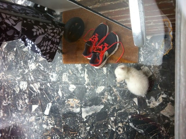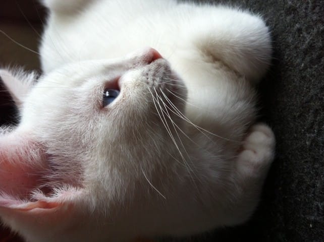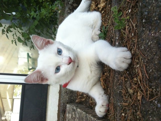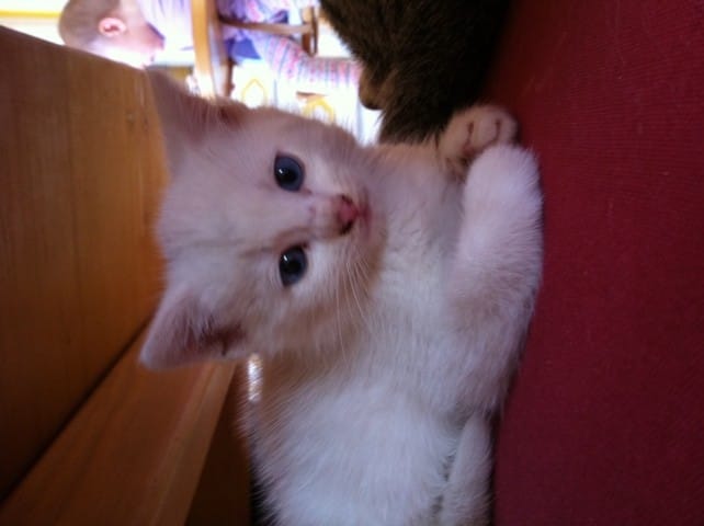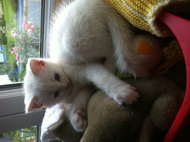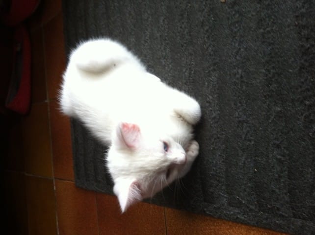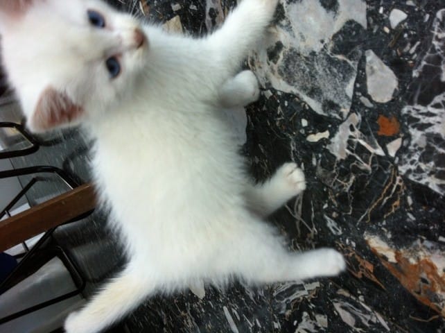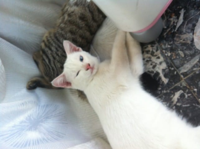 un jour, en allant au boite aux lettre de ma rue, j'ai trouvé un chaton tout petit, tout blanc, tout crasseux et pleins de tiques. je l'ai ramener chez moi. je l'ai nourri et immédiatement traiter contre les puces. je lui enleva 5tiques.