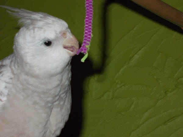 Lili, femelle lutino d'âgé d'environ 1 an quand je l'ai eu. J'ai crue, pendant toute son existence, que c'était un mâle. Il c'est relever, quelque mois après sa mort, que c'était en réalité une petite femelle. J'aurais du m'en douter. Elle n'a jamais chanter comme Gipsy et rare était les fois au je l'entendait "crier" parce que oui je ne pouvais pas appeler ça crier tellement elle était douce quand elle le fessait. Dès les première minute on l'on c'est vue, elle ma tout de suite accorder sa confiance. J'ai mi ma main dans la cage et elle est directement monter dessus ♥ Le début d'une belle histoire d'amour entre moi et mon premier oiseau... Elle adorait sortir. Elle appréciait beaucoup les friandise à base d'oeufs que je lui fessait :) C'était un régale chaque jour de la voir s'épanouir et elle me donnait tant d'amour ma boule de plume...