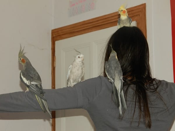 Les 3 premiers mois, elles sont rester en cage sans sortir (je ne pensait pas les laisser sortir et puis à l'époque elle était dans la salle à manger, ouvert sur le salon et la cuisine et j'avais 5 chats, tous de grand chasseurs... Autant vous dire impossible à sortir)