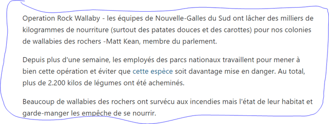 C est pas honteux ça? et on est surement pas les seuls.On entend rien des USA riche pays(trump s en vante assez) ni de la russie ,ni des émirats arabes,rois du pétrole.Des tweers et articles dans les journaux ca vi.Les discours n apportent rien,les actes vi !!!!!!!!!!! non ,je me présenterai jamais a une élection et je ne vote plus,malgré l obligation depuis 15 ans.Une bande de parvenus pourri qui s en fiche pas mal des animaux.Enfin hier,la pluie est enfin apparue la bas et 2 feux qui s étaient fusionnés ont été maitrisés.C est la bonne nouvelle,si je puis dire.Ces pompiers de la bas qui luttent pendant des heures,des jours,au péril de leurs vies sont des héros,de véritables héros et un énorme chapeau pour eux. gigi397