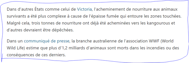 On voudrait tellement faire un miracle pour que ce feu s arrete,sauver les personnes et les animaux.Quelle perte pour l humanité.A l heure actuelle,le chiffre des animaux ayant perdu la vie(toutes especes) se monte a 1milliard 800millions. C est une véritable catastrophe et de rares ministres des finances débloquent des sommes dérisoires pour sauver ce qui peut encore l etre tandis que notre ministre a débloquer 50 millions d armes pour la Syrie !!!!!!!