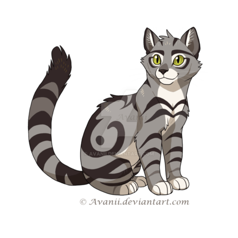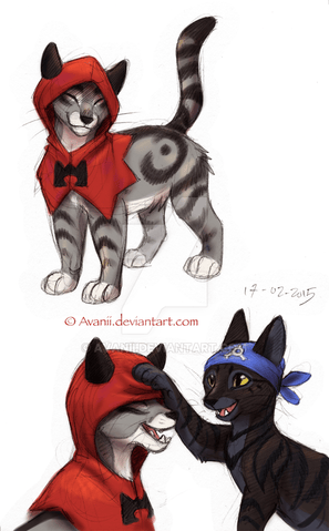 Félix, 1 an, mâle, vagabond, clan du feu, yeux vert, dragueur, possède une cape rouge, n'aime pas suivre les règles, pelage gris clair avec rayure gris foncé :