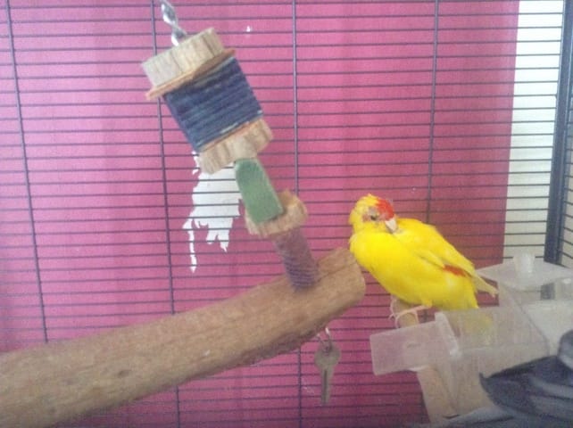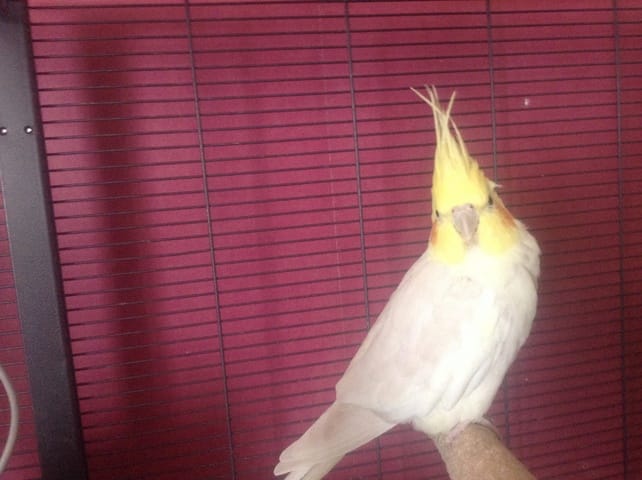 Furie, femelle de 1 an EPP. Elle est albinos. Arrivée à la maison le 17 novembre 2013 a l'âge de 6 mois. Adopté à un éleveur lors d'une bourse aux oiseaux. Des ses premiers jours à la maison elle c'est très bien habituer à la vie: sortie en liberté, entente avec les autres... Elle n'aime pas trop jouer. Préfère rester tranquille sur la balançoire. Adore crier très fort alors que personne ne l’embête . Elle pince très fort aussi. Jamais à sang mais juste assez pour l'assez les marques de son bec. Enfin bref! Elle porte bien son nom.