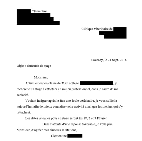 Voici donc le sujet de ma question : je suis confrontée au choix de mon stage de 3eme , j'ai donc soigneusement sélectionnée des entreprises en lien avec mon orientation , mes choix sont plutôt orientées sur des réserves et des zoos , mais mon problème étant que je ne sais pas quoi marquer dans ma lettre , comment mettre toutes les chances de mon coté ?