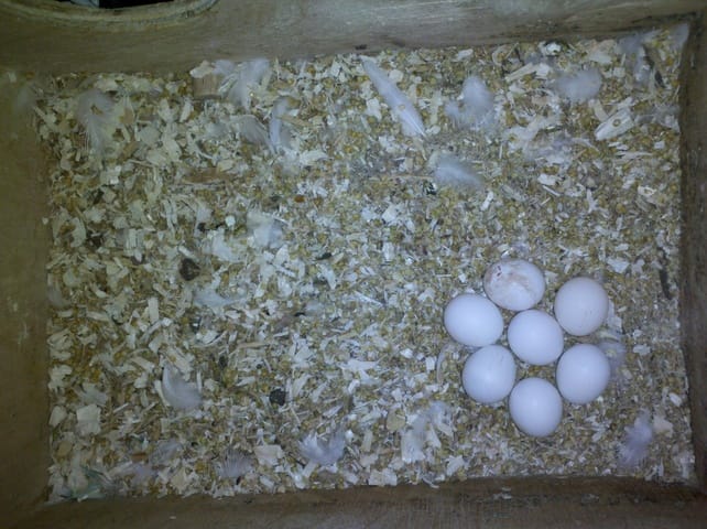 Il y a maintenant 13 jours, Furie a pondu son premier œuf (30/10/14), et tout les 2 jours 1 autre. Elle en est a son 7ème actuellement et il y en aura peut être un autre demain. A moins qu'elle est fini (ce qui serais pas mal pour une première couvée :p ).