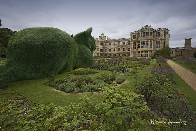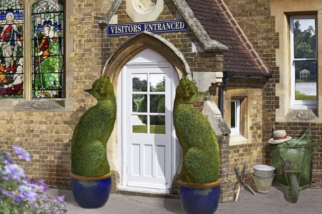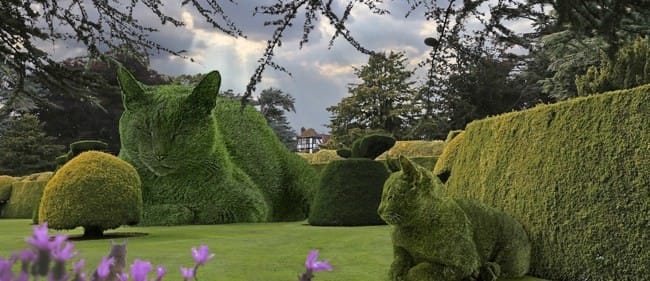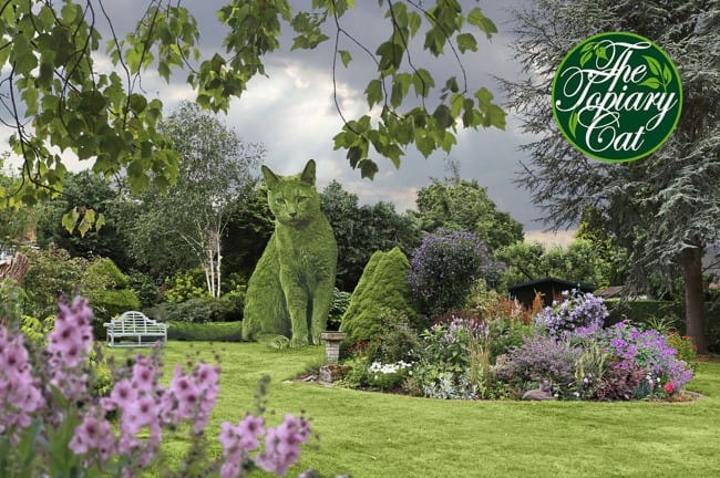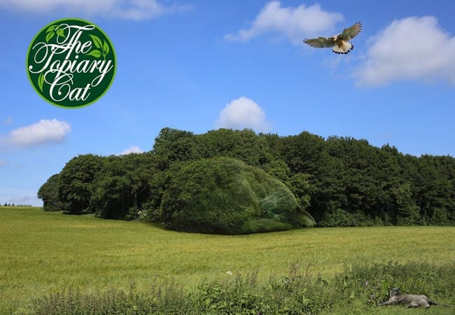 Ces photos que vous postez viennent du peintre anglais surréaliste, Richard Saunders qui, utilise des arbustes épais et des arbres pour créer ses énormes chat. Le prototype qui lui a servi est son chat décédé Tolly et de race '' Bleu russe''.