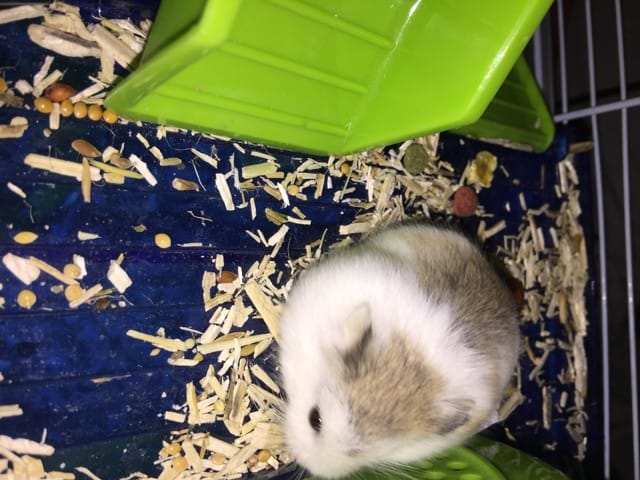 - Et le petit dernier arrivé, Vlad, hamster de Roborovski bicolore de quelques mois qui raffole du pop-corn et des vers de farine.