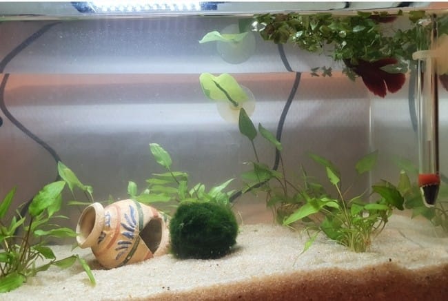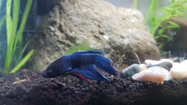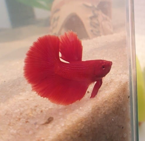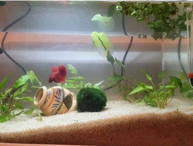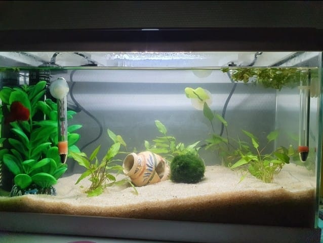 La plante en plastique est en attendant d'aller en chercher des vraies surtout qu'il dort dedans donc se serait dommage qu'il abime ses belles nageoires... Je voulais prendre quelques lentilles d'eau car il n'est pas fan de la led et ça lui permettrait de se sentir plus à son aise avec la lumière. Pour les plantes qui ont besoin d'être plantées je vais devoir attendre car j'ai du sable de Loire et pas de substrat pour les racines...