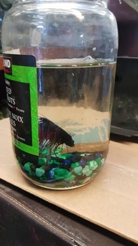Et ça, c'est l' aquarium à la noix de Yakusa de quand il était à l'animalerie! Si, si, regardez bien, c'est bien un bocal pour noix! C'en est presque drôle... du moins, ça le serait si il n'y avait pas de poisson dedans... :(