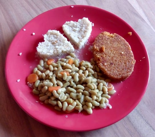 Ce n'est pas un vrai simili carne le bidule ovale, mais ça remplace un steak. Les petits cœurs c'est du quinoa, dedans il y a plein de vitamines qu'on trouve dans la viande.