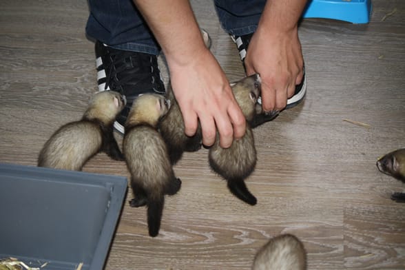 Nous l'avons installé dans une cage à 5 étages pour qu'il ait suffisamment de place. Nous l'avons fait sortir hier soir dans le salon. Après avoir exploré un peu, il s'est approché de mon mari et a gratté sur sa jambe. Il a donc retiré sa jambe mais un peu brusquement puisque le furet l'a mordu. Il a probablement eu peur de ce mouvement vif. Il l'a pris par la peau du cou en lui disant "non" pour lui expliquer qu'il n'avait pas à faire cela, puis il l'a remis dans sa cage. Pas de bâillement.
