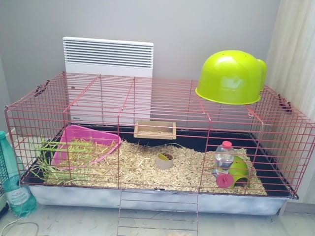 Dans le bac à litière je mets de la litière pour chat végétale elle est collée au râtelier du foin pour qu'ils mangent leur foin et fassent leurs besoins en même temps pour le sol de vous pouvez mettre du lino des tapis etc..