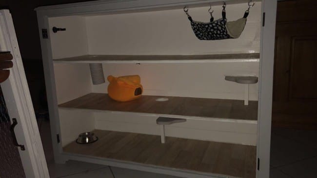 Pour un furet, il faut une cage à plusieurs étages (ce que vous avez réalisé), pas de barreaux en zinc car risque d’intoxication ! Pour un furet d’intérieur, l’exposition lumineuse de la cage doit être limitée à 12 h/j MAXIMUM (lumière naturelle et/ou artificielle), donc tout dépend de l'emplacement de votre cage pour ceci. Pour la taille, environ 100 * 50 * 50cm pour 1 furet (je pense que votre meuble doit correspondre à peu près).