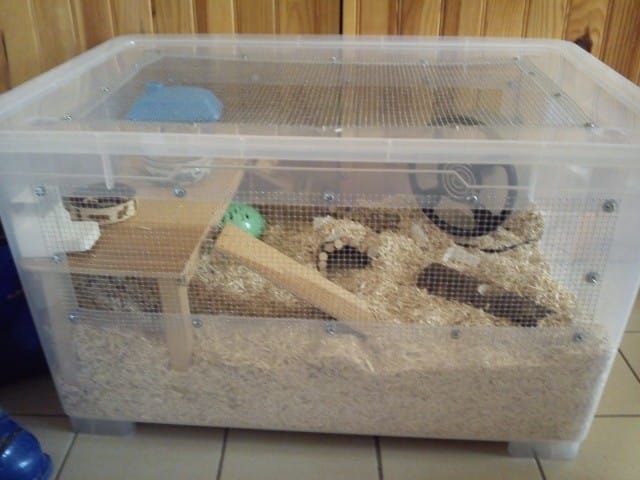 Une bin-cage pourrait convenir. Prenez la plus grande taille que vous trouvez (minimum 80X50), certaines font plus de 100cm de long. Voici des explications sur la construction d'une bin-cage :