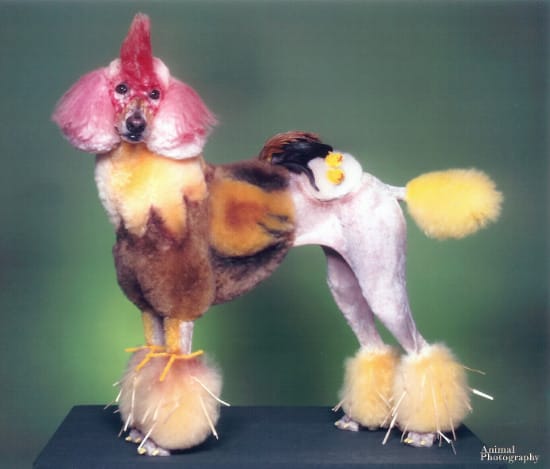 Le “Color Highlight” du groupe américain Pet Society, avec lequel les maîtres peuvent teindre en doré, orange, rose, cuivre ou bleu les poils de leurs animaux de compagnie (cf. photo ! Je suis sur que le pauvre caniche a honte et se dit qu’il ressemble à un Bisounours).