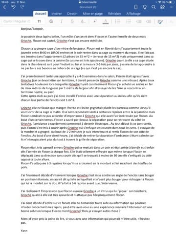 Lorsqu'ils pourront se rencontrer sans grilles, vous pouvez laisser faire lors qu'ils se reniflent, se montent dessus gentiment ou se chassent sans se poursuivre, par contre il vous faut intervenir si l'un des lapins tyrannise clairement l'autre, comme c'est le cas avec Flocon, et laissez à Grioche un moyen de se mettre à l'abri, car la terreur qu'elle ressent quand elle est acculée est très mauvaise, à la fois pour sa santé et pour sa relation avec Flocon. Il faut dire non à Flocon et le repousser avec la main autant de fois qu'il faudra, mais ne pas terminer la rencontre à ce moment, sinon Flocon retient qu'en faisant le tyran, on le débarrasse de l'intrus. Ne le laissez pas la mordre non plus. Il faut travailler à ses rencontres régulièrement, tous les jours, en augmentant à chaque fois le temps qu'ils passent ensemble si tout se passe bien, ou revenir à l'étape avec grilles si ça ne s'arrange pas. ça demande du temps, et de la patience.