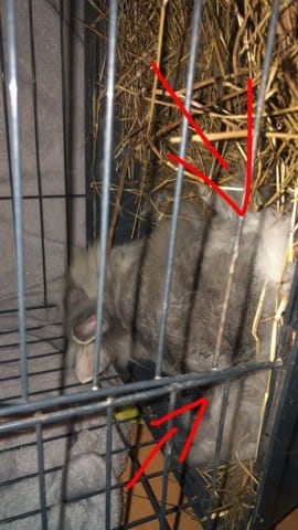 Un des lapereaux a l’air très vigoureux et ne fait que se déplacer partout (ce qui me fait douter de leur « âge ») il rampe en poussant avec ses pieds il finit parfois sur le dos mais se promène dans toute la cage