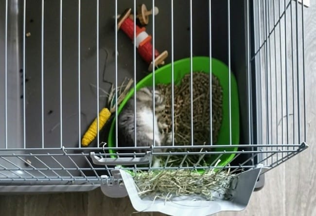 Il faudra rapidement changer de bac à litière parce qu'elle va grandir et celui-là ne suffira pas, un bac à litière pour chat par exemple c'est très bien. Pour le fond de la cage et le sol, il lui faudrait aussi des couvertures.