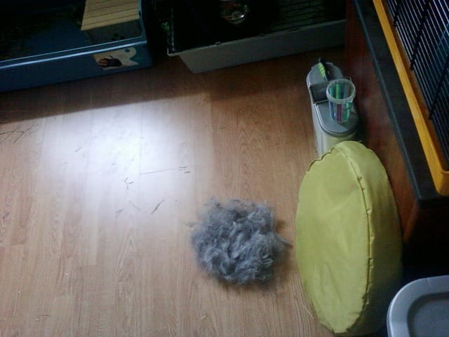 eh oui deux fois par an il faut ôter un maximum de poils du lapin pendant sa mue (au printemps vers mars et à l'automne mois d'octobre) sinon il risque d'en ingérer trop et ainsi boucher son estomac et ses intestins. Je voulais vous montrer ce que je viens d'ôter à ma lapine, la pauvre elle me fait mal au coeur, c'est un lapin basique niveau poil mais quand elle mue on dirait un Teddy, prochain coup je ferai une photo avant et après